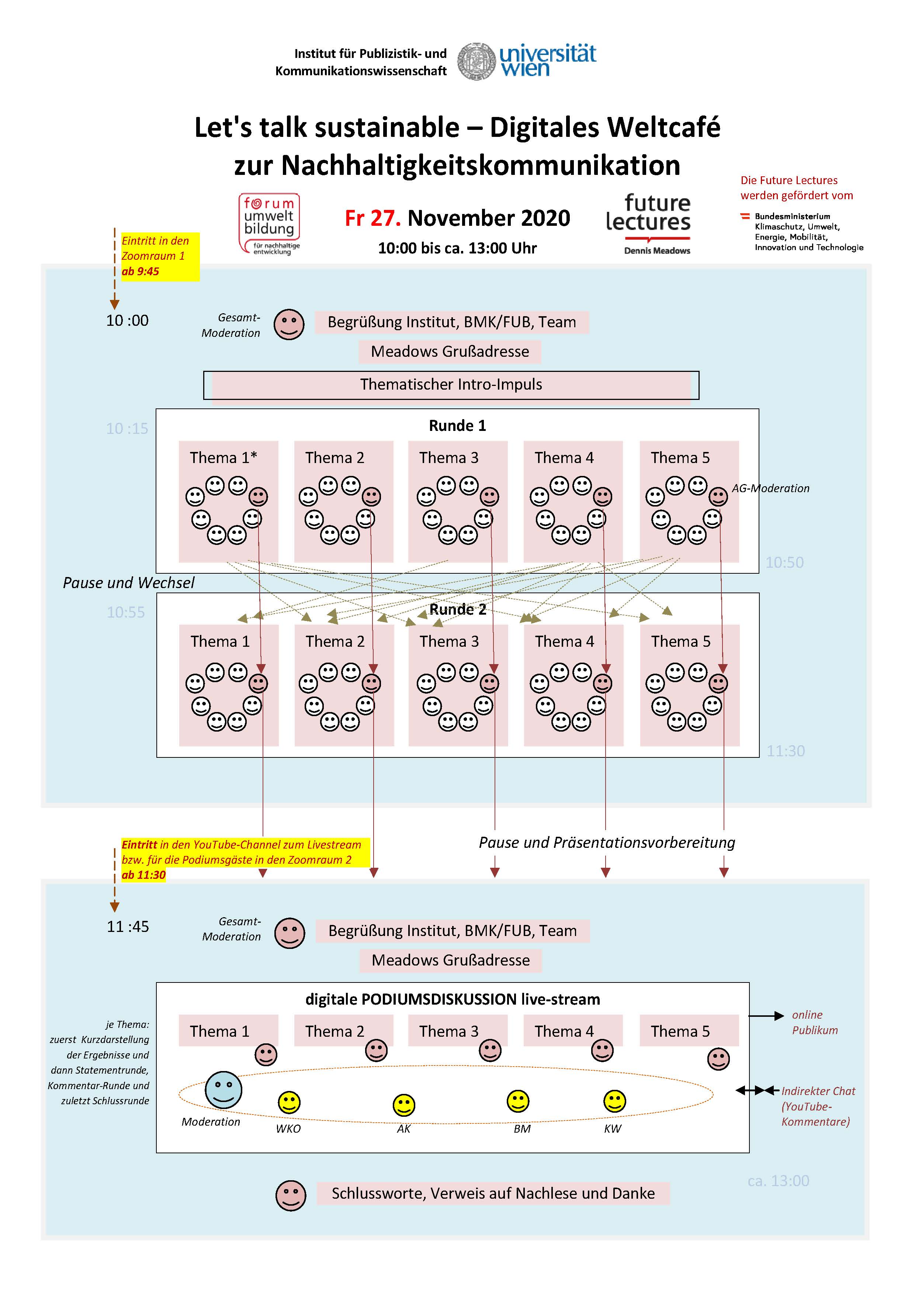 Um 10 Uhr startet der erste, interne Teil des Events: ExpertInnen, PraktikerInnen, Studierende, Lehrende, Forschende und andere Interessierte werden in fünf Fokusgruppen geteilt. Zwei Mal zu je 35 Minuten diskutieren die Gruppen über fünf zentrale Kernfragen der Nachhaltigkeitskommunikation, verhandeln ihre Problemsicht und sammeln Ideen für Lösungsstrategien. Dabei haben die Teilnehmenden in beiden Runden Gelegenheit zu wechseln und somit jeweils bei zwei Themen mitzuwirken: