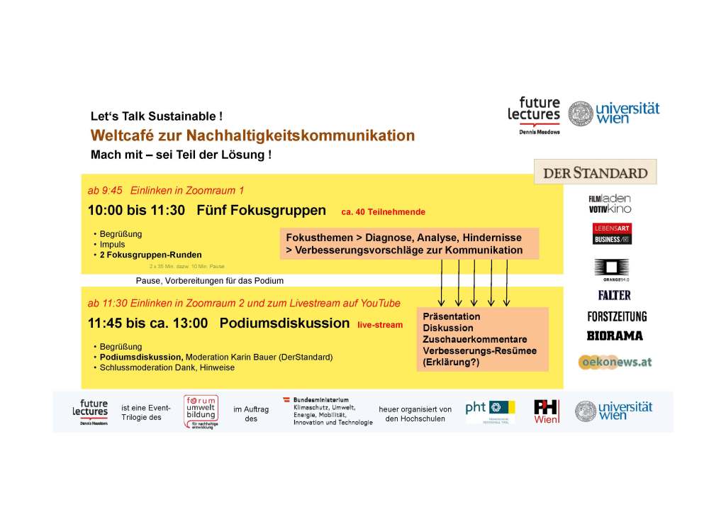 Um 11:45 Uhr geht es in die nächste Runde. Im zweiten öffentlich gestreamten Teil des Events, moderiert von Karin Bauer (DerStandard) , präsentieren die Fokusgruppen die Ergebnisse ihrer Arbeit im Podium. Diese werden anschließend mit kompetenten Vertretern aus dem Klimaministerium, der Wirtschaftskammer, der Arbeiterkammer und einem Kommunikationswissenschafter diskutiert. Ziel ist es am Ende eine gemeinsame Erklärung oder zumindest eine Statement-Liste mit „konstruktiven Anregungen für eine gemeinsame Strategie zur Verbesserung der Nachhaltigkeitskommunikation“ zu erhalten. Dieser Teil der Veranstaltung kann online mittels eines zugesendeten Links via Streaming mitverfolgt werden. Dabei besteht die Möglichkeit, via Chat Fragen und Anmerkungen einzubringen, die von unserer ChatModeration zusammenfassend in die Diskussion eingebracht werden. Wer interessiert ist, die Podiumsdiskussion (ab 11:45 Uhr) via Streaming zu verfolgen bzw. die Mitschnitte der